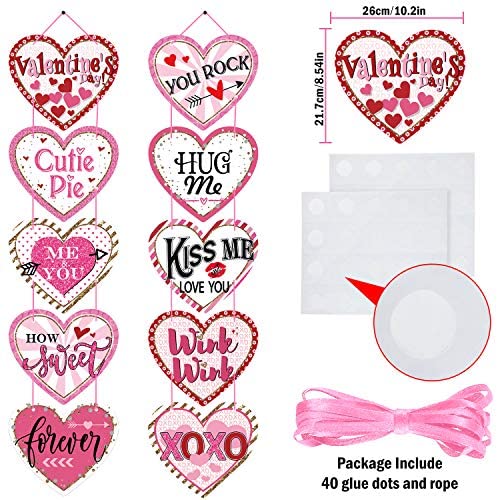 Valentines Day decorations: these valentines party supplies are printed with Valentine’s Day, cute pie, how sweet, forever and etc., which representing the sweetness between lovers, fits for Valentines Day as welcoming front door signs or party decorations, make your home or party full of sweet atmosphere What you will get: includes 10 pieces Valentines Day crafts, which are made of sturdy card stock with surface laminated for a durable and long lasting use, each card size is 8.7 x 10.2 inches/ 22 x 26 cm; Also comes with 2 ropes and 40 glue point dots Design: these Valentines Day decorations are mainly in red, pink and white color, designed with heart shapes and romantic words, which can be applied as wall decorations, party pendants and photo props, pasting to anywhere you like to decorate your Valentines Day, wedding party and etc. Multi style: the valentine heart decor can be assembled together applied as banner, or as decorative sign to stick on door, wall, windows and so on; And you can hold the card in hand directly as photo prop Applicable occasions: wonderful for Valentines Day, wedding party, anniversary, engagement party, holiday decoration, can be applied at home or anywhere you like, which will go well with different party decorations and give you the effect you want