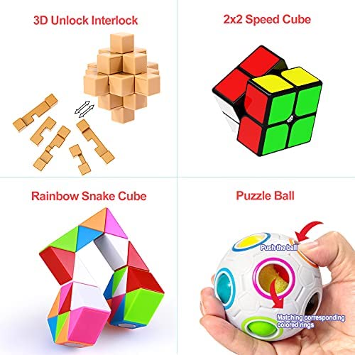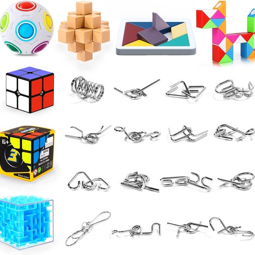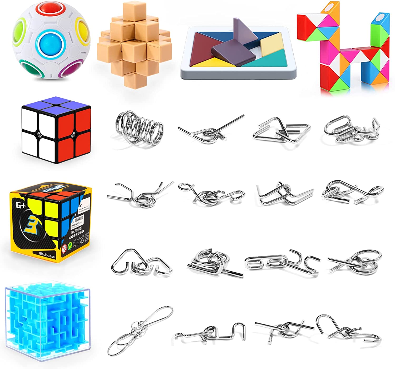 [High Quality Material]: This brain teaser puzzle set is made of high quality safe ABS material and long lasting non-fading. Smooth corners, easy to clean, durable and easy to carry. [Different Challenges]: This brain teaser puzzle cube set contains 23pcs different puzzle toys, each toy has different challenges. Its a ideal brain teaser puzzle toy for children, teens, and adults, whether at home, at the workplace or on the go. [Great Puzzle Game]- These brain teaser puzzle game will never go out of style, they can help kids enhance hand-eye coordination and memory, stimulate their imagination and creativity, keep them away from Mobile/Computer/TV. And play these puzzle game in spare time can relieve the work pressure of adults. [Perfect Gift]- Christmas, birthday, Thanksgiving, Halloween, Childrens Day and etc are the perfect opportunity to gift this 3D brain teaser toy to family and friends. You can have fun with them, enjoy your funny time. [Package Includes]- This speed cube pack includes 1*2×2 speed cube, 1*3×3 speed cube, 1*3D Maze Box, 1*3D unlock interlock, 1*rainbow snake cube, 1*puzzle ball, 1*tangram, 16*metal wire puzzle Toy.