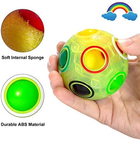 Safe Material- This rainbow puzzle ball crafted with eco-friendly ABS material, non-toxic and harmless, lightweight and lies comfortably in the hand. Fun to Play- This is a big rainbow ball with 12 holes and 11 colorful small balls inside, and a sponge in the center that allows the colorful balls to slide from one slot to the next when you press on them. You need to match all 11 balls to their corresponding colored rings to complete the puzzle. Enjoy Your Time- The diameter of this fidget ball is only 7cm, small, handy and can be taken anywhere. Its a ideal pastime toy for children, teens, and adults, whether at home, at the workplace or on the go. Say goodbye to boredom! Good for All Ages- The magic ball is a puzzle game that requires concentration, careful observation and thinking, which can exercise the brain and improve the problem solving ability. And it can help kids reduce screen time and increase thinking skills, relieve work pressure of adults. Perfect Gift- Christmas, birthday, Thanksgiving, Halloween, Childrens Day and etc are the perfect opportunity to gift this cube ball toy to family and friends. Play with them, by which can promote relationships between you.