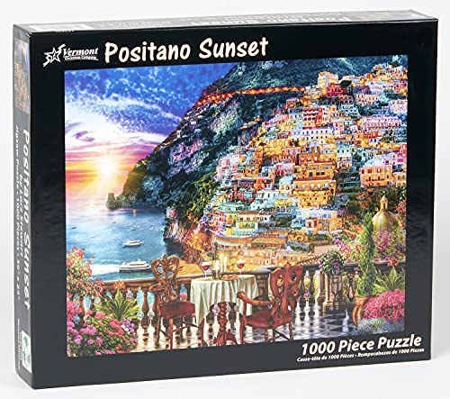 Jigsaw puzzle includes 1000 pieces & measures 30 x 24 when completed. Fully interlocking and randomly shaped pieces. Produced on thick, premium quality puzzle board. Precision cutting with minimal dust. Made with recycled materials. A captivating jigsaw puzzle of famous Positano at sunset.