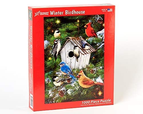 Jigsaw puzzle includes 1000 pieces & measures 26 5/8 x 19 1/4 when completed. Fully interlocking and randomly shaped pieces. Produced on thick, premium quality puzzle board. Precision cutting with minimal dust. Made with recycled materials. The lovely winter setting makes this jigsaw puzzle perfect for any bird lover.