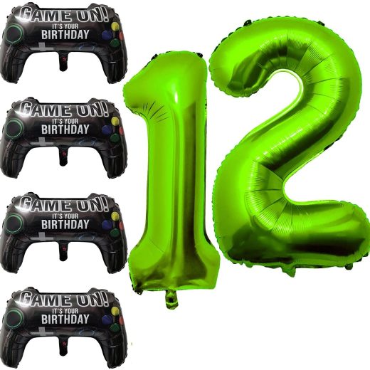 Video Game Party Balloons 4pcs Game Controller Mylar Balloons with 40inch Green Number Balloons 12 for Birthday Party Game Party Decoration (12th)