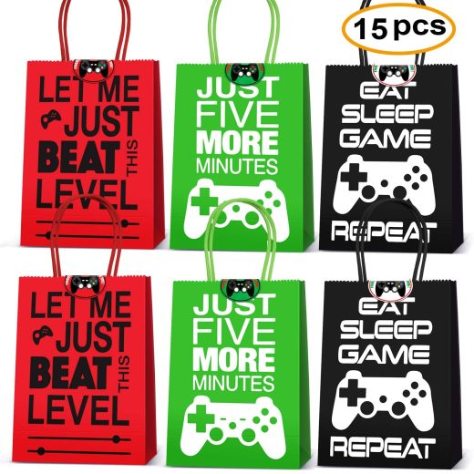 Video Game Party Supplies: 15 packs Video Game party bags in 3 designs with black,red and greencolor featuring a console controller, decorated with LET ME JUST BEAT THIS LEVEL,EAT SLEEP GAME PEPEAT and JUST FIVE MORE MINUTES written on both front of the bag. Perfect for giving out party favors and small gifts. Game Of Party Supplies Size Measurement: Each gaming party bag at the size of 8.0 x5.8 x3.1 inches. These video game party bags are the perfect containers for candies, gifts,goods in the video game themed parties decorations. Video Game Party Favors Best Quality : These game of birthday party bags are made of high quality craft paper, each bag has a reinforced, gusseted bottom to hold more of any assorted knick-knacks, toys,or small objects when being carried. they are sturdy,lightweight and no smell. Package up tons of fun for your next super hero party supplies birthday party with these video game paper party bags. Game Of Favor Bags A Variety Use: These gamer party bags can be used as gift bags,usual storage bags and party decorations that candies, cookies, snacks, small toys and more can be put into, perfect for kids video game themed party, baby showers, kids video game birthday party decorations, arts & craft activities and much more. Satisfaction:Our top priority is customer satisfaction,so your purchase comes with a monn,please contact with us,We will answer in 24 hours.ey-back . Have any question