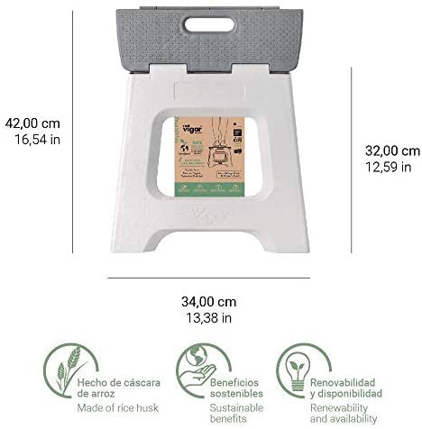 MULTIPURPOSE STEP STOOL – Great for cleaning the top of the fridge, changing light bulbs, and accessing high cabinets; perfect for anyone in need of a boost to reach the bathroom sink or kitchen counter NON-SLIP GRIP – Durable textured base prevents slipping; stabilizing rubber feet keep the stool safely in place COMPACT & PORTABLE – Internal double handle makes for easy carrying; folds and unfolds with a single movement and hangs from handle for compact storage ECO-FRIENDLY DESIGN – 100% recyclable design is made from bio-based plastic derived from sustainable rice husk and polypropylene made from 80% recycled plastic; non-toxic and BPA-free DETAILS & DIMENSIONS – Maximum weight capacity of 330-pounds; measures 13-1/3-inches long by 11-inches wide by 12-3/5-inches high when unfolded; wipe with a damp cloth as needed; recommended for indoor use only; do not store outdoors or leave in direct sunlight; imported