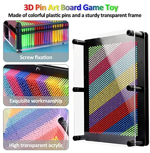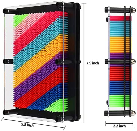 High QualityThis 3D Pin Art Toy made of colorful plastic pins and a sturdy transparent frame. Large size 8 x 6 x 2 inches, weight 1.1 pound. Recommended 6 years up. Features a thick clear plastic front and pin screen design Inspire imagination and creativity Excellent tactile and imaginative stimulation can help enhance childrens attention and develop their creativity and imagination. Easy to PlaySimply put use your hands, face, feet or any everyday objects like toys and shapes pressed onto the pins, which will create amazing 3D sculptures. Simply push the pins back and your canvas is ready again for whatever your mind is brewing up. There are endless ways to design this toy. Popular Novelty ToyPin art Board is perfect for any children to play with their friend and family members. It will bring more happy pastime time at home or school playtime. Perfect Gift & DecorationThe 3D Pin art Board not only a toy, also can be a artistic decoration for your room or office. And it is a good creative gift for children or friends.