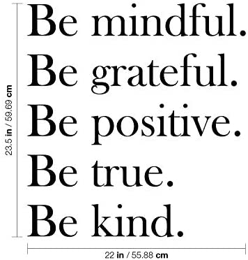 ? Our high-quality vinyl adhesive decal quote Be Mindful. Be Grateful. Be Positive. Be True. Be Kind comes in 23.5 inches by 22 inches. The pictures are for display and inspiration only. All of our vinyl wall decals are manufactured with premium industrial grade Lutema self-adhesive vinyl. ? This is a removable peel and stick decal that is perfect way to make a statement without having to break the bank. This one is great for your kids room, playroom or office without worrying about damaging your walls. ? Get a cute & inspirational decal quote. It can be applied to all clean smooth surfaces including interior walls, mirrors, doors, windows, depending on the size. ? This peel-off vinyl decal is easy to remove with no residue left behind. Includes easy step-by-step instructions on how to effortlessly apply it. Our self-adhesive, non-toxic stickers are waterproof, durable and will last for years without peeling, wrinkling or fading. ? In general, vinyl lettering is one of the latest and greatest trends in modern decoration. Because our products are high quality, they give the illusion of painted wall art without the mess, cost, or time. What are you waiting for? Lets get crafty!