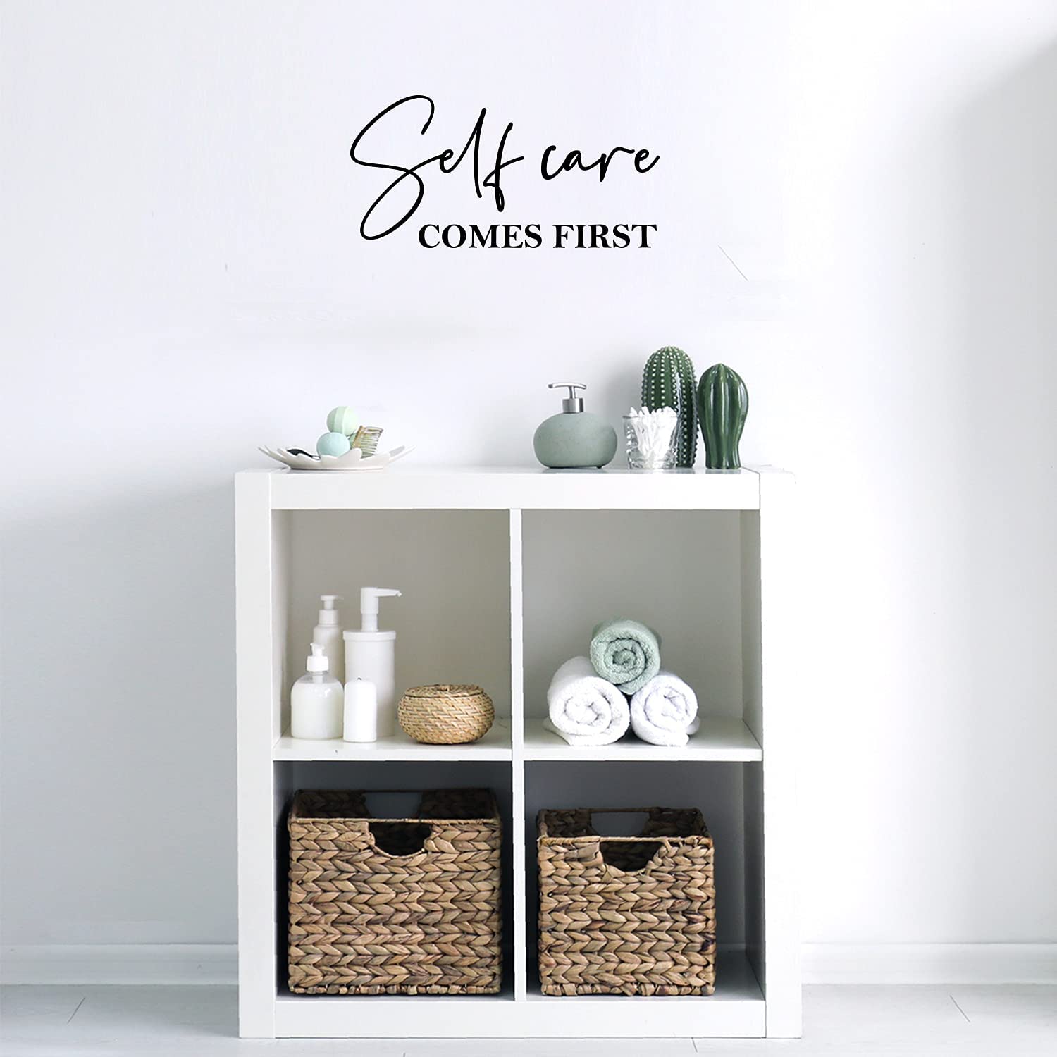 Our high-quality vinyl adhesive decal quote Self Care Comes First comes in 7.5 inches by 15 inches. The pictures are for display and inspiration only. All of our vinyl wall decals are manufactured with premium industrial grade Lutema self-adhesive vinyl. This is a removable peel and stick decal that is perfect way to make a statement without having to break the bank. This one is great for your skincare center, boutique or makeup area. Get an inspirational decal quote. It can be applied to all clean smooth surfaces including interior walls, mirrors, doors, windows, depending on the size. This peel-off vinyl decal is easy to remove with no residue left behind. Includes easy step-by-step instructions on how to effortlessly apply it. Our self-adhesive, non-toxic stickers are waterproof, durable and will last for years without peeling, wrinkling or fading. In general, vinyl lettering is one of the latest and greatest trends in modern decoration. Because our products are high quality, they give the illusion of painted wall art without the mess, cost, or time. What are you waiting for Lets get crafty!