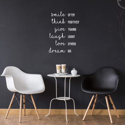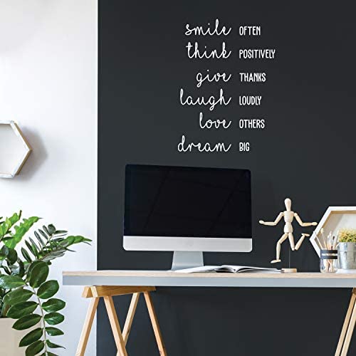 Our high-quality vinyl adhesive decal quote Smile Often Think Positively Give Thanks Laugh Loudly Love Others Dream Big comes in 30 inches by 22 inches. The pictures are for display and inspiration only. All of our vinyl wall decals are manufactured with premium industrial grade Lutema self-adhesive vinyl. Our removable peel and stick decal quotes, sayings, and designs are a perfect way to make a statement without having to break the bank. This one is great for your dorm room, coffee shop or store. Get an inspirational decal quote. It can be applied to all clean smooth surfaces including interior walls, doors, windows, mirrors, cupboards, stairs, glass, laptops, luggage, car windshields and bumpers, thermos, coffee mugs and school binders depending on the size. This peel-off vinyl decal is easy to remove with no residue left behind. Includes easy step-by-step instructions on how to effortlessly apply it. Our self-adhesive, non-toxic stickers are waterproof, durable and will last for years without peeling, wrinkling or fading. In general, vinyl lettering is one of the latest and greatest trends in modern decoration. Because our products are high quality, they give the illusion of painted wall art without the mess, cost, or time. What are you waiting for Lets get crafty!