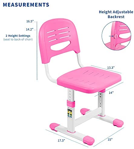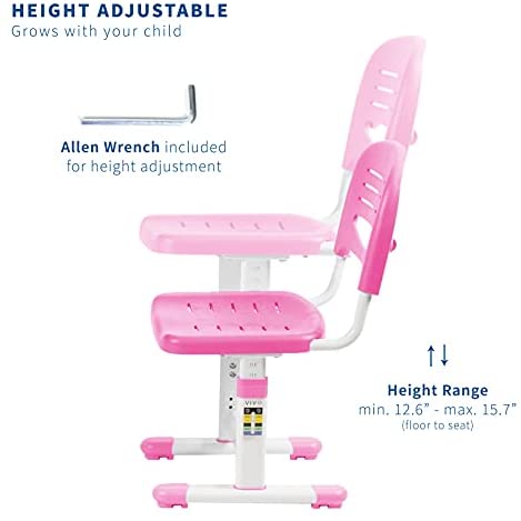 VIVO Kids Chair Solutions – We create affordable solutions designed with creativity and quality to give your kiddos the comfort they deserve. DESK-V201P-CH is a children’s pink desk seat featuring a height adjusting system that grows with your little one. Universal Design – This classic chair will complement a variety of kids’ desks on the market thanks to its universal design. It’s a great way to establish a designated work area for e-learning and home school setups. Recommended for ages 3 to 10. Height Adjustable – Raise or lower the seat to accommodate your child’s height with a design that encourages good posture for a healthy setup. The seat adjusts from 12.6” to 15.7”. Smart Support – The chair frame is made of solid steel for a setup that lasts. The sturdy feet are slightly elevated for a leveling effect that works on a variety of floor types. Weve Got You Covered – This versatile design is backed by a 3 Year Manufacturer Warranty and friendly tech support to help with any questions or concerns.