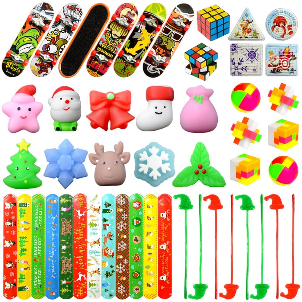 Package Include:(48pcs in total) 12pcs Christmas Slap Bracelets 10pcs Christams Squishies 8pcs Christmas Sticky Hats 6pcs Finger Skateboards 6pcs Puzzle balls 4pcs Christmas Maze Puzzles 2pcs Mini Magic Cubes.