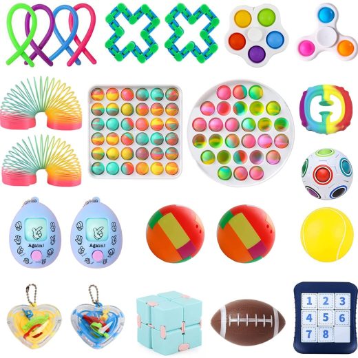 Fidget sensory toys help relieve stress, calm nerves and increase focus for children and adults, especially those with ADHD, ADD, OCD and autism.Ideal for parties, holidays, classrooms or use as office toys. The toys keep you alert and focused throughout the day and help to develop new ideas.A variety of toys can effectively attract childrens attention and exercise sensitivity, expand thinking and cultivate creativity. Works to pass the time and control kids with tantrums and boredom while they are staying indoors.Anxiety reliever toy for adults. It helps adults release and relieve stress. Or pass the time boringly. And enhance the attention of adults. It helps redirect unconscious habits such as leg shaking, knuckle cracking, nail-biting, hair twirling, etc. Its a fun way to keep the brain focused and the hands busy.A variety of toys can effectively attract attention and exercise sensitivity, expand thinking and cultivate creativity. It can also foster your kids sense of space and enhance a childs memory by playing the magic cube, puzzle ball, or maze puzzle.You can bring it anywhere and put it in your pocket. These amazing gifts are very portable and can be played anywhere and taken to schools, offices, restaurants, tutoring, camping, road trips, and even hospitals.You get:This set has 24 Piece of sensory toys in total.Includes 2 * Wacky Track 1*Squeeze Football 1* Magic Cube 4* Stretchy Strings 2* Fidget Spinners 2*Puzzle Balls 1*Snapper Fidget Toys 2*Pop Bubble Sensory Fidget Toy 1*Digital Huarong Road 2*Rainbow circle 2*Scissors Egg Toy 2*Heart-shaped maze1 x Basketball foam ball1 x Rugby foam ball