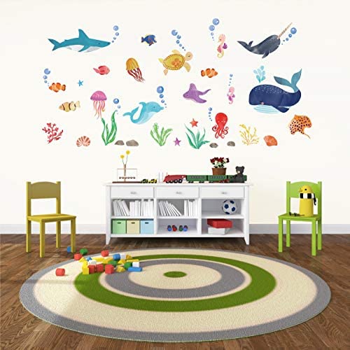 Watercolor Ocean Creatures/Under The Sea Fish Wall Decor/Peel & Stick Wall Art Stickers Decals for Kids Room/Nursery/Living Room/Playroom/Classroom