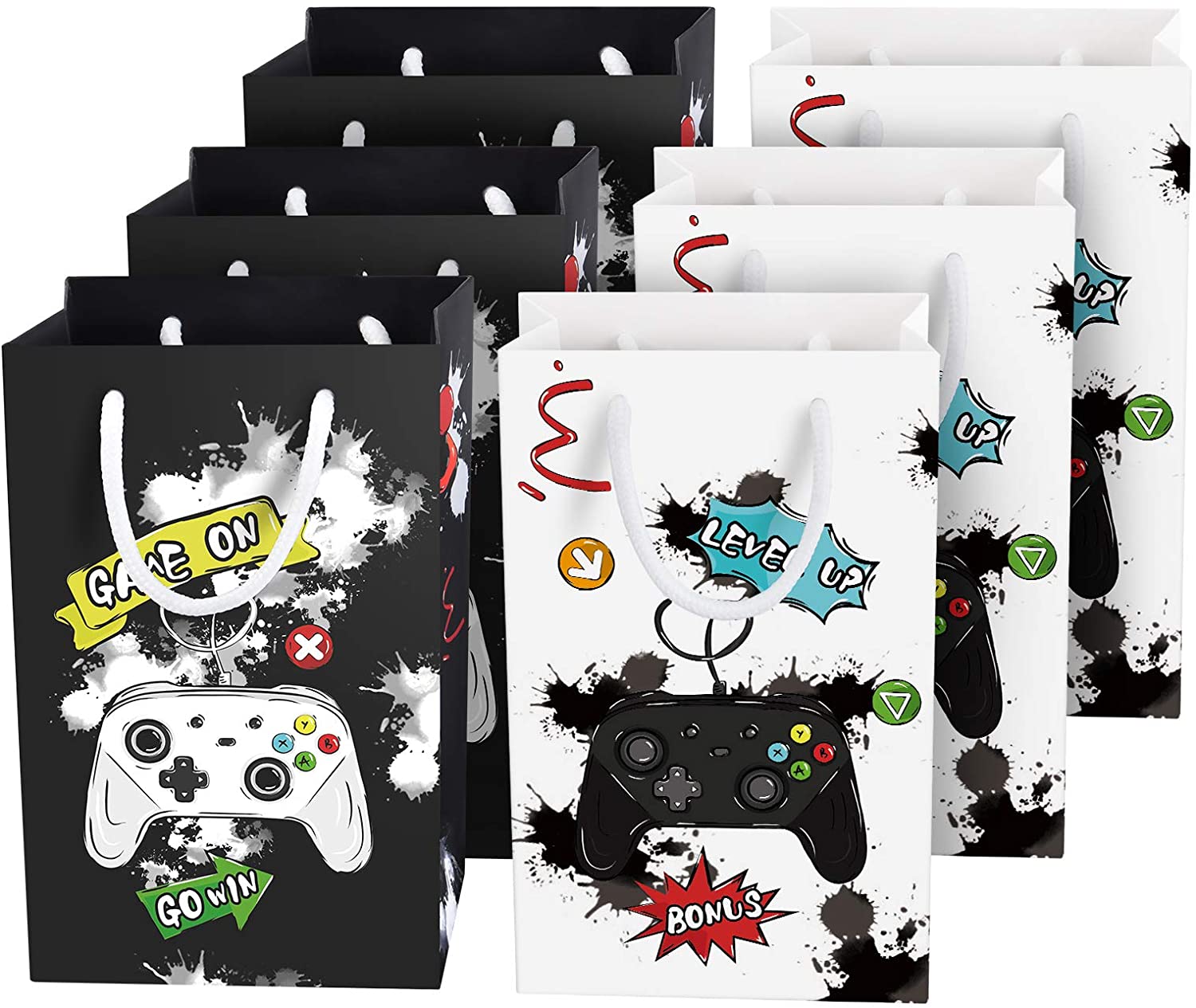 Watercolor Video Game Party Bags – 16 Pack Goodie Bags for Boys Kids Game Theme Party Supplies Favor Bags Candy Treat Loot Gift Bags with Handle (Black & White)