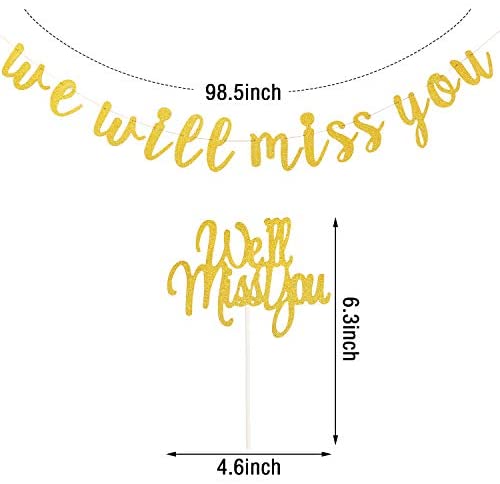 Good party decoration: the we will miss you banner and cake topper set express your sincere blessing and love for the departing friends or colleagues, nice combination for you to prepare an impressive retirement party Glittery appearance: this decoration set features gold glittery appearance, instantly catch up peoples attention, easily make you friends notice this surprising and thoughtful gift at first sight, leave you an unforgettable party memory Durable material: this banner and cake topper decorations set are made of thick glitter paper, durable and sturdy to use, shiny luster under the light, the topper is made of quality bamboo, smooth surface and fine texture Easy to use: the glitter banner is equipped with several holes for your easy assembly, the distance between each letter can be adjusted according to your favor, easy and convenient to hang on different places Suitable occasions: suitable for decorating retirement, going away, office work, job change, farewell party and graduation ceremony, leaving the leaver a warm and sweet party time