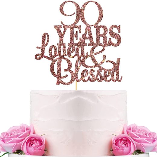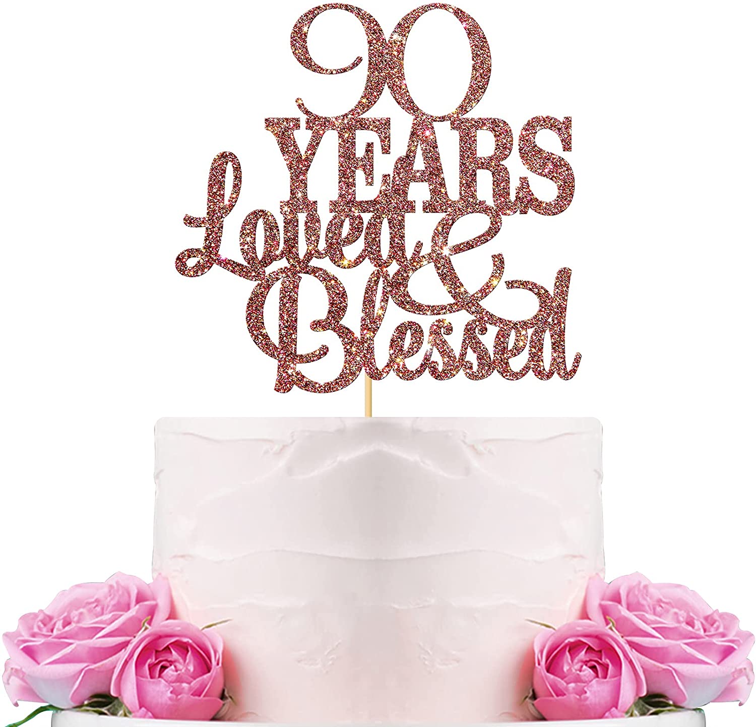 WeBenison 90 Years Blessed & Loved Cake Topper 90th Birthday Cake Topper Marriage Anniversary Birthday Party Decoration Supplies Rose Gold Glitter