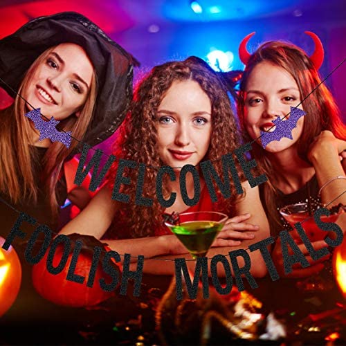 What you will get: 1Pcs Black Glittery Welcome Foolish Mortals Banner,Unique Bat Design,Perfect for Halloween Party Decoration,Worth buying it!! Pe…