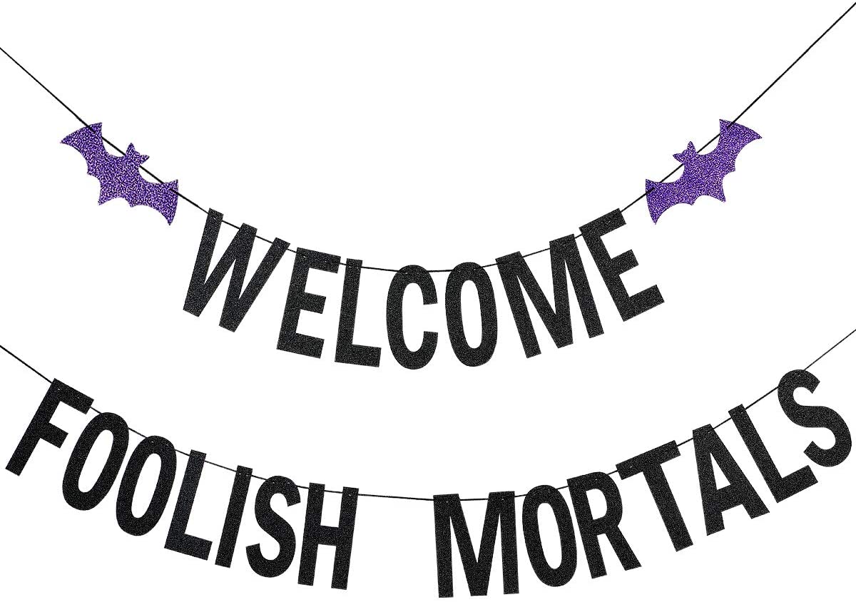 Welcome Foolish Mortals Banner Black Glitter- Hocus Pocus Party Decorations,Halloween Party Decorations,Haunted House Decorations,Bats Decorations,Welcome Foolish Mortals Sign