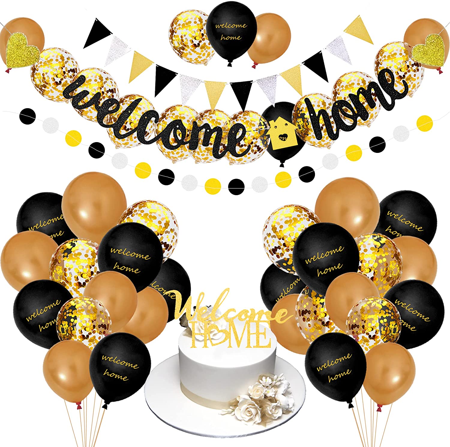 Welcome Home Banner And Cake Topper Decorations Gold Black Glitter Dot Circle Garland Triangle Flag Banner Welcome Balloons For Welcome Back Party Housewarming Party Supplies
