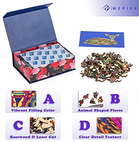 COLORFUL ASSEMBLED PIECES – Rich pattern filling color and the high-definition picture quality make this wooden jigsaw puzzles looks vivid. A surface coating process keeps the color stable and resists water stains. PREMIUM WOOD CRAFT – Weve carefully selected a higher quality basswood materials better than the normal cheap paper. You can safely assemble the jigsaw puzzles without paper dust and enjoy the pure wood experience. ANIMAL SHAPED DESIGN – The puzzles outline shape are based on the animals in the natural and parts of them are anthropomorphized in cartoons. And also, you can find some bonus scenes with the little cute animal shaped pieces. BEAUTIFUL HOME ARTWORK – Laser edge cutting process and the full expressive details makes the puzzles to be an exquisite artwork. You can decorate your walls with this in a photo frame or stick it to a hangable decorative board. NICE GIFT FOR ALL AGES – Its a perfect choice to train the brains capacity for any ages in solving problems and thinking skills. With the gift packing box, it can be an excellent gift for your friends or familis.