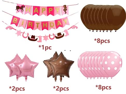 This package set include 1 Horse Happy Birthday Banner,1 Horseshoe Boot Guns Garland, 2 Brown and 2 Pink Star Shaped Mylar Balloons,16 Latex Balloo…