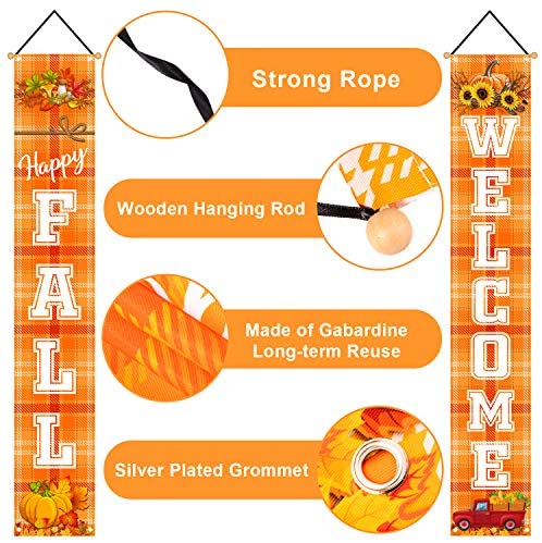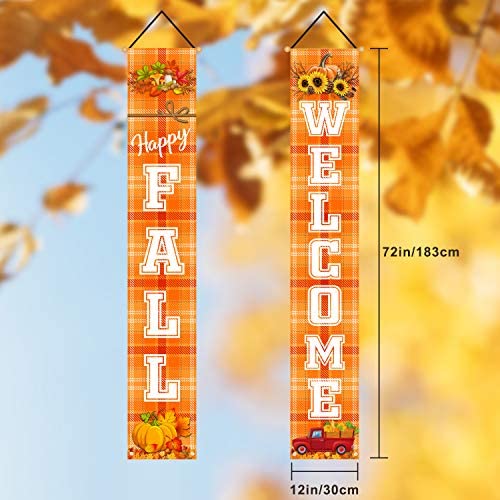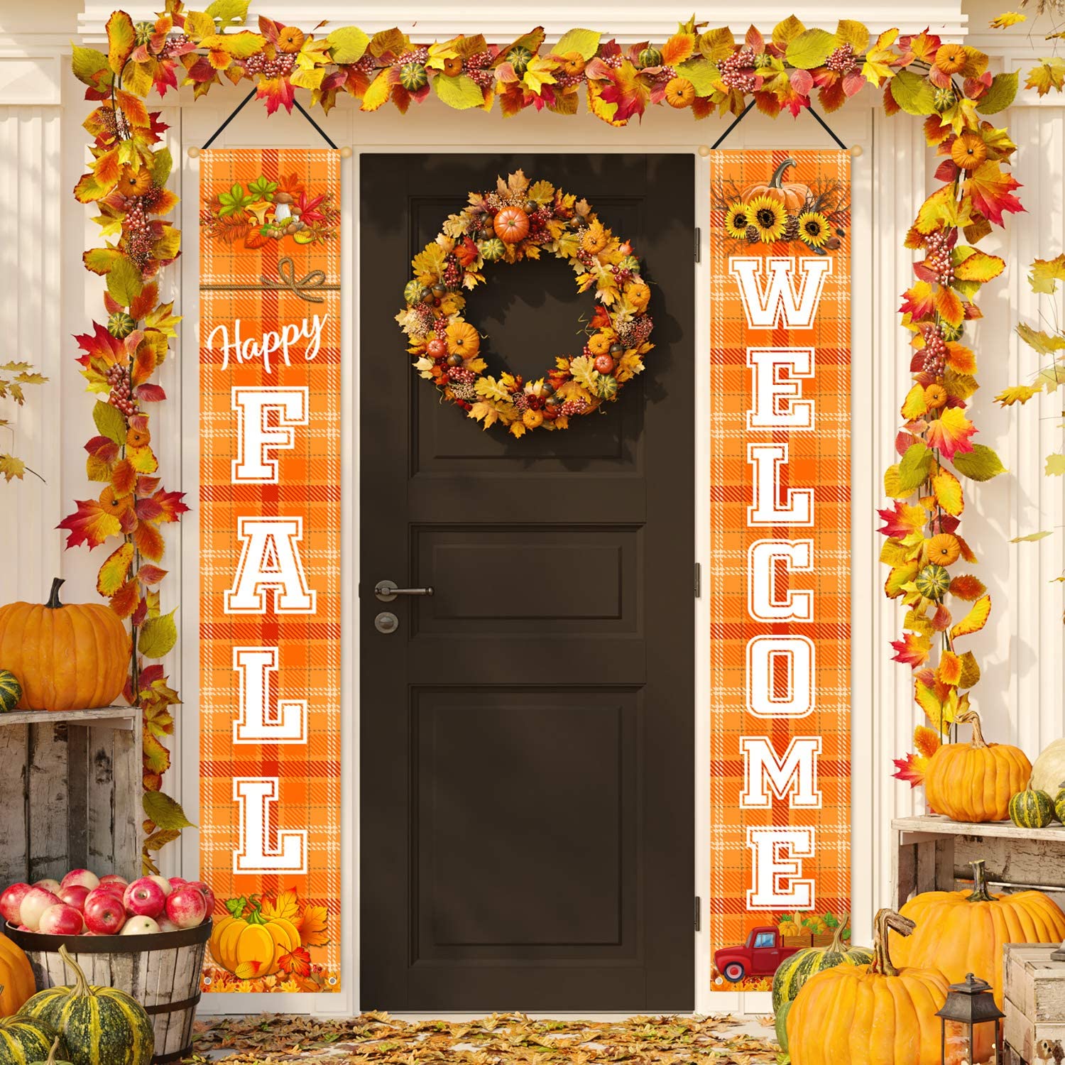 Whaline Fall Decoration Welcome Happy Fall Porch Sign Orange Plaid Sunflower Pumpkin Door Sign Rustic Autumn Hanging Banner for Indoor Outdoor Home Farmhouse Yard Harvest Thanksgiving Party Decor