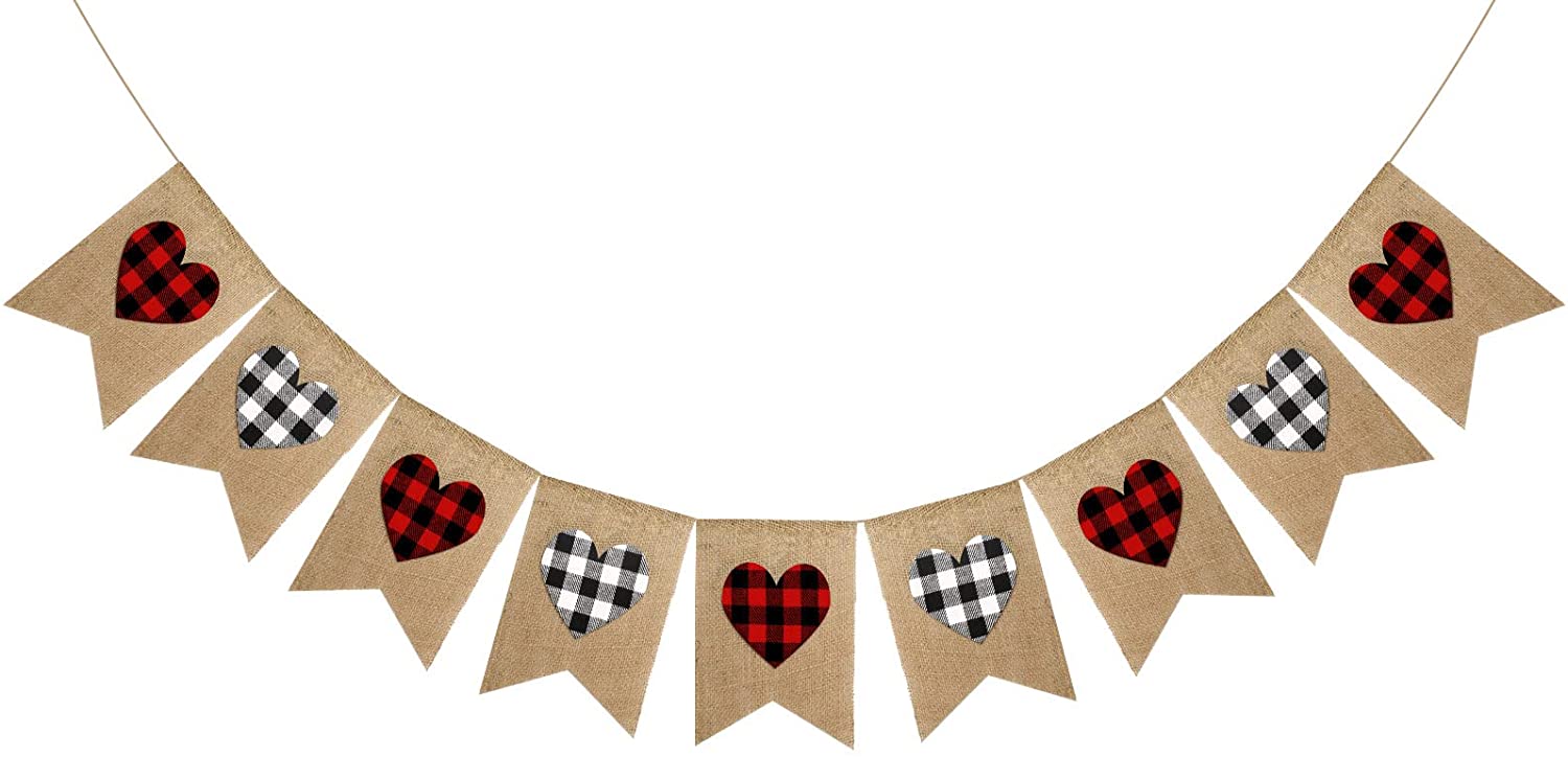 Whaline Valentines Day Burlap Banner with String Black Red White Plaid Heart Banner Pre-Assembled Vintage Banner Fireplace Wall Hanging for Party Wedding Anniversary Home Decoration