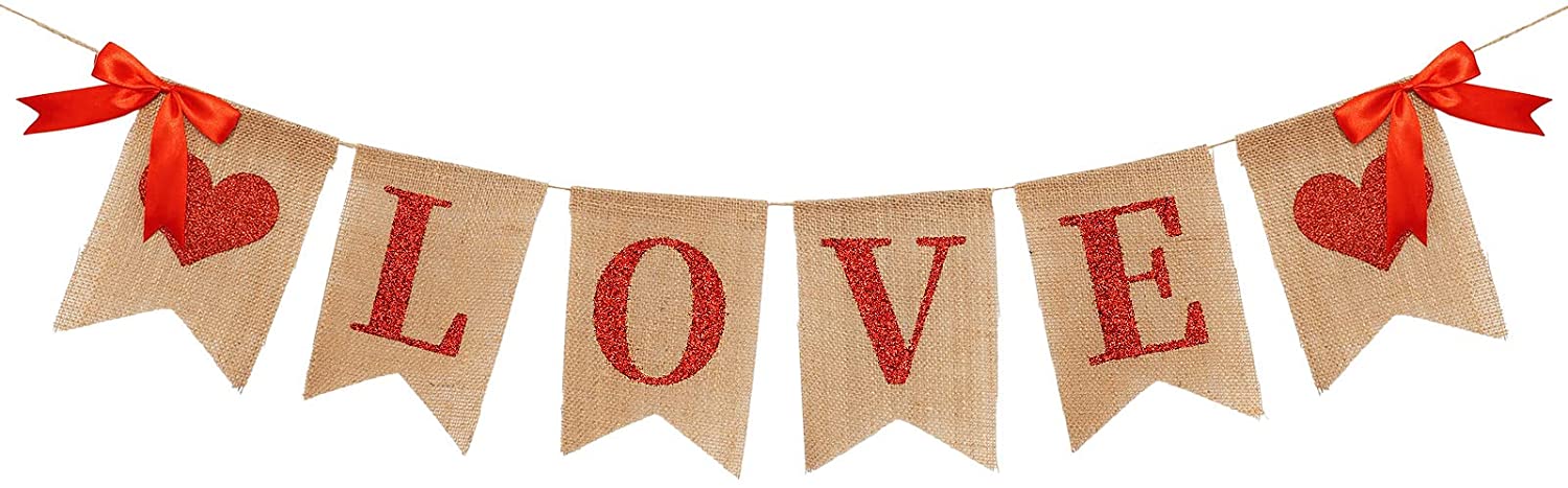 Whaline Valentines Day Burlap Banner with String Red LOVE Heart Banner Pre-Assembled Vintage Banner Fireplace Wall Hanging for Party Wedding Anniversary Home Decoration
