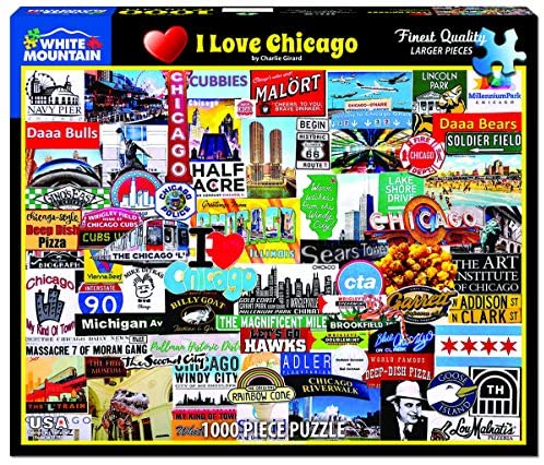 I LOVE CHICAGO: Charlie Girard’s I Love Chicago collage puzzle is for the Chicago fans whether they love its sports teams, food, fine museums, interesting architecture, or great people. HIGH QUALITY DESIGN: This fun 1000 piece jigsaw puzzle contains thick interlocking pieces made from recycled premium blue chipboard that give a sturdy feel and easy grip. Made in the United States. Finished size is 24” x 30”. SPARE TIME: This puzzle comes with thicker and larger pieces, so it’s easier to grip and put together. It’s a favorite leisure activity for winter holidays or for any other relaxing time. For kids, puzzles are a unique alternative to toys. FAMILY ACTIVITY: Puzzle building is a great family activity, allowing children & parents to relax together. With the included box lid stand, it’s easy for everyone to reference the picture at the same time. ART & PICTURES: White Mountain presents beautiful puzzles created with photography and artwork. The paintings and photos include detailed images of natural landscapes, people, objects, and other classic designs.