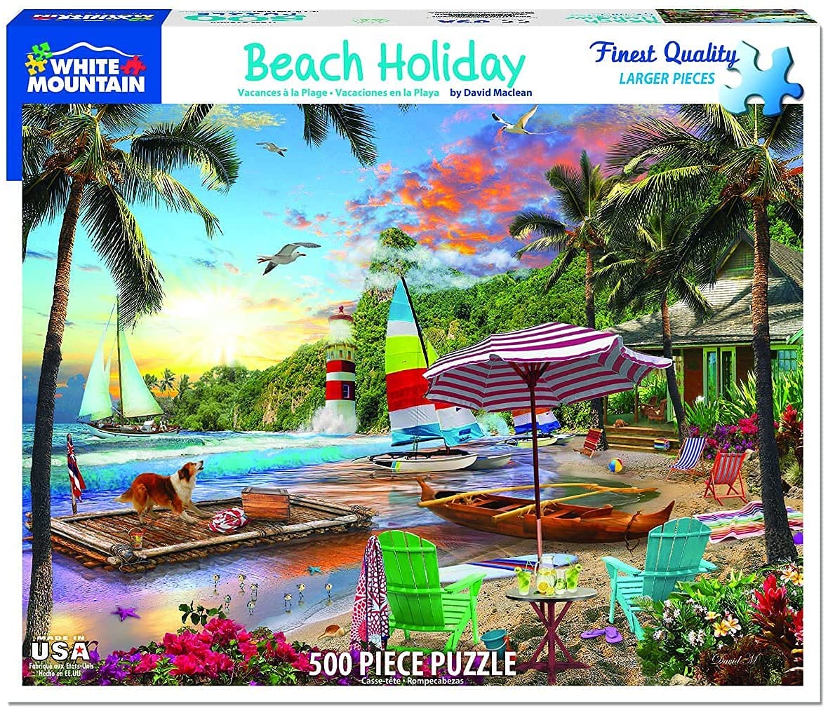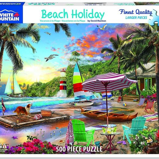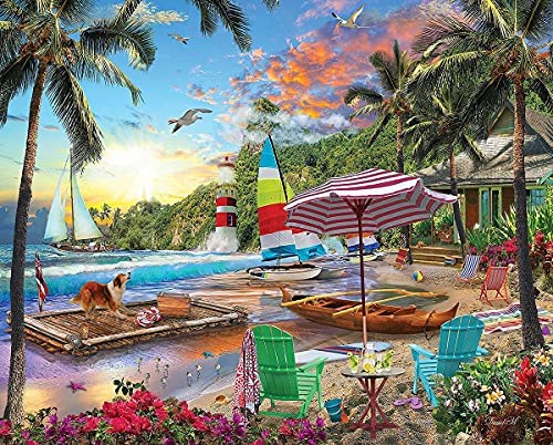BEACH HOLIDAY: This tropical paradise includes a beautiful sky, happy collie, beach house, sailboats, and other delights that are all created by artist David Maclean on a 500 piece puzzle. HIGH QUALITY DESIGN: This 550 piece jigsaw puzzle contains thick interlocking pieces made from recycled premium blue chipboard that give a sturdy feel & easy grip. Made in USA. Finished size 18” x 24”. SPARE TIME: Thicker & larger pieces are easier to grip & put together. Puzzles are a favorite & fun leisure activity for relaxing winter holidays. For kids, puzzles are a unique alternative to toys. FAMILY ACTIVITY: Puzzle building is a great family activity, allowing children & parents to relax together. With the included poster, it’s easy for everyone to reference the completed picture. BEAUTIFUL ART: White Mountain presents puzzles created with photography & artwork. The paintings & photos include detailed images of natural landscapes, people, objects, & other classic designs.