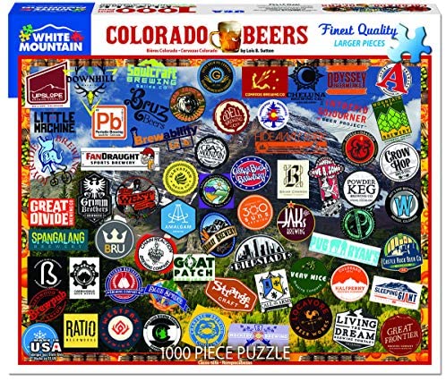 COLORADO FUN: Here is a selection of beer labels for us against a backdrop of Rocky Mountain scenery, including Soul craft, Twisted Pine, Spangalang and Intrepid Sojourner. Great names for great brews! Send some joy: lovely puzzle artwork can evoke joyous memories of home, or spark conversations of past good times! sure to delight, share the art and fun long distance or just treat yourself! Amazing benefits of puzzle building: puzzles enhance motor skills, hand-eye coordination & problem solving skills. Delays cognitive decline, improves short term memory, mood & spatial awareness. Puzzle artistry: combines the artwork with the design of the cut pieces to enhance the enjoyment of the user. Complexity of cut, artistry & detail are all evident of the quality of each piece. Quality pieces: 1000 extra large, easy to handle interlocking pieces made of sturdy blue chipboard on recycled paper. Completed Dimensions: 24 x 30 inches. 100% satisfaction. Made in USA.