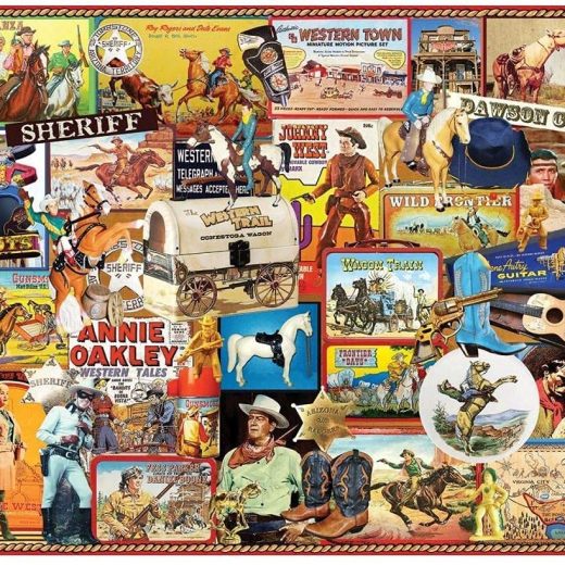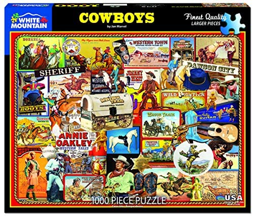COWBOYS PUZZLE: Enjoy a piece of the wild west in this puzzle that features a collage of western icons including sheriffs, cowboys, cowgirls, horses, and wagons. HIGH QUALITY DESIGN: This 1000 piece jigsaw puzzle contains thick interlocking pieces made from recycled premium blue chipboard that give a sturdy feel & easy grip. Made in USA. Finished size 24”x30”. SPARE TIME: Thicker & larger pieces are easier to grip & put together. Puzzles are a favorite & fun leisure activity for relaxing winter holidays. For kids, puzzles are a unique alternative to toys. FAMILY ACTIVITY: Puzzle building is a great family activity, allowing children & parents to relax together. With the included box lid stand, it’s easy for everyone to reference the picture. BEAUTIFUL ART: White Mountain presents puzzles created with photography & artwork. The paintings & photos include detailed images of natural landscapes, people, objects, & other classic designs.