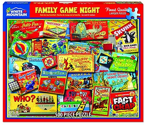 FAMILY GAMES: Enjoy a colorful collection of vintage board games and a few more recent family-favorite games, assembled in the fantastic 500-piece puzzle Family Game Night by Lois B. Sutton. FUN FOR ALL: Thrill and challenge your family and friends piecing together an incredible 500-piece jigsaw puzzle. Bring home hours of fun and of entertainment everyone will enjoy. ABOUT THE ARTIST: Enjoy the masterful design artistry of Lois B. Sutton. Known for his vintage illustrations, Lois’ art puzzles are detailed, bright and colorful. MORE TO PUZZLE BUILDING: Art jigsaw puzzles are a fun, inexpensive way to enjoy works of art firsthand. Use to boost valuable motor skills, hand-eye coordination, and problem solving skills. SPECIFICS: Includes 500 extra large puzzle pieces made of sturdy blue chipboard on recycled paper. Puzzle dimensions (completed): 18 x 24 inches. 100% customer satisfaction guarantee. Made in USA.