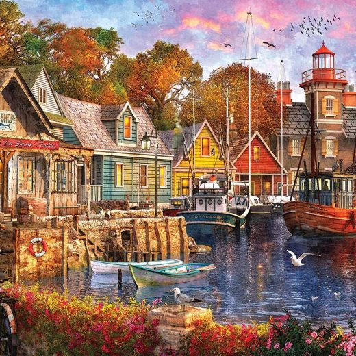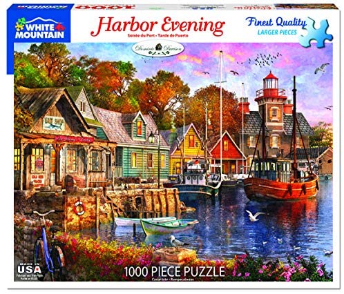 BY THE SEA: Fall comes to visit this seaside town where beer and bait can be purchased. Boats fill the harbor waiting for morning when another day of fishing can begin before winter sets in. SEND SOME JOY: Lovely Puzzle Artwork can evoke joyous memories of home, or spark conversations of past good times! Sure to delight, share the art and fun long distance or just treat yourself! AMAZING BENEFITS OF PUZZLE BUILDING: Puzzles enhance motor skills, hand-eye coordination & problem solving skills. Delays cognitive decline, improves short term memory, mood & spatial awareness. PUZZLE ARTISTRY: Combines the artwork with the design of the cut pieces to enhance the enjoyment of the user. Complexity of cut, artistry & detail are all evident of the quality of each piece. QUALITY PIECES: 1,000 extra large, easy to handle interlocking pieces made of sturdy blue chipboard on recycled paper. Completed dimensions: 24 x 30 inches. 100% satisfaction guarantee. Made in USA.