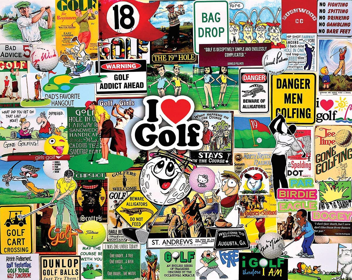 GOLFING: Rediscover your love of golf in this collage puzzle by designer Charlie Girard which features colorful images, icons, and signs that represent golf and everything associated with it. HIGH QUALITY DESIGN: This 1000 piece jigsaw puzzle contains thick interlocking pieces made from recycled premium blue chipboard that give a sturdy feel & easy grip. Made in USA. Finished size 24”x30”. SPARE TIME: Thicker & larger pieces are easier to grip & put together. Puzzles are a favorite & fun leisure activity for relaxing winter holidays. For kids, puzzles are a unique alternative to toys. FAMILY ACTIVITY: Puzzle building is a great family activity, allowing children & parents to relax together. With the included poster, it’s easy for everyone to reference the completed picture. BEAUTIFUL ART: White Mountain presents puzzles created with photography & artwork. The paintings & photos include detailed images of natural landscapes, people, objects, & other classic designs.