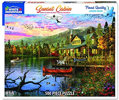 CABIN PUZZLE: Geese fly, ducks cruise, and the family dog keeps a sharp eye on its owner. It’s the perfect place to watch a colorful sunset. Artist Dominic Davison. 500 piece puzzle with a finished size of 18” x 24”. HIGH QUALITY DESIGN: This 500 piece jigsaw puzzle contains thick interlocking pieces made from recycled premium blue chipboard that give a sturdy feel & easy grip. Made in USA. Finished size 18”x24”. SPARE TIME: Thicker & larger pieces are easier to grip & put together. Puzzles are a favorite & fun leisure activity for relaxing winter holidays. For kids, puzzles are a unique alternative to toys. FAMILY ACTIVITY: Puzzle building is a great family activity, allowing children & parents to relax together. With the included box lid stand, its easy for everyone to reference the picture. BEAUTIFUL ART: White Mountain presents puzzles created with photography & artwork. The paintings & photos include detailed images of natural landscapes, people, objects, & other classic designs.