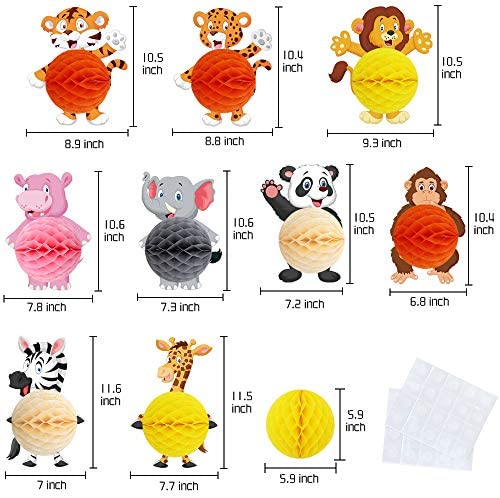 WILD JUNGLE ANIMAL HONEYCOMB BALL CENTERPIECES What Will You Get 9 Cutouts of Jungle animals: – 1 Lion cutout (high – 10.5 inches, wight – 9.3 inches) – 1 Tiger cutout (high – 10.5 inches, wight – 8.9 inches) – 1 Leopard cutout (high – 10.4 inches, wight – 8.8 inches) – 1 Giraffe cutout (high – 11.5 inches, wight – 7.7 inches) – 1 Zebra cutout (high – 11.6 inches, wight – 7 inches) – 1 Elephant cutout (high – 10.6 inches, wight – 7.3 inches) – 1 Hippo (high – 10.6 inches, wight – 7.8 inches) – 1 Orangutan cutout (high – 10.4 inches, wight – 6.8 inches) – 1 Panda (high – 10.5 inches, wight – 7.2 inches) 18 Honeycomb, each honeycomb is 5.9 inches 40 Dot glue HOW TO USE A. Take out 4 or more glue dots and paste the glue dot on honeycomb, both front and back. B. Paste the honeycomb on cutout, both front and black of cutout. C. Open the honeycomb on front and back cutout and paste the other side of honeycomb on cutouts. D. Open the the leg cutout carefully. And put it on table to see if it stay well, if not, press down the cutout, make sure it stay stable.