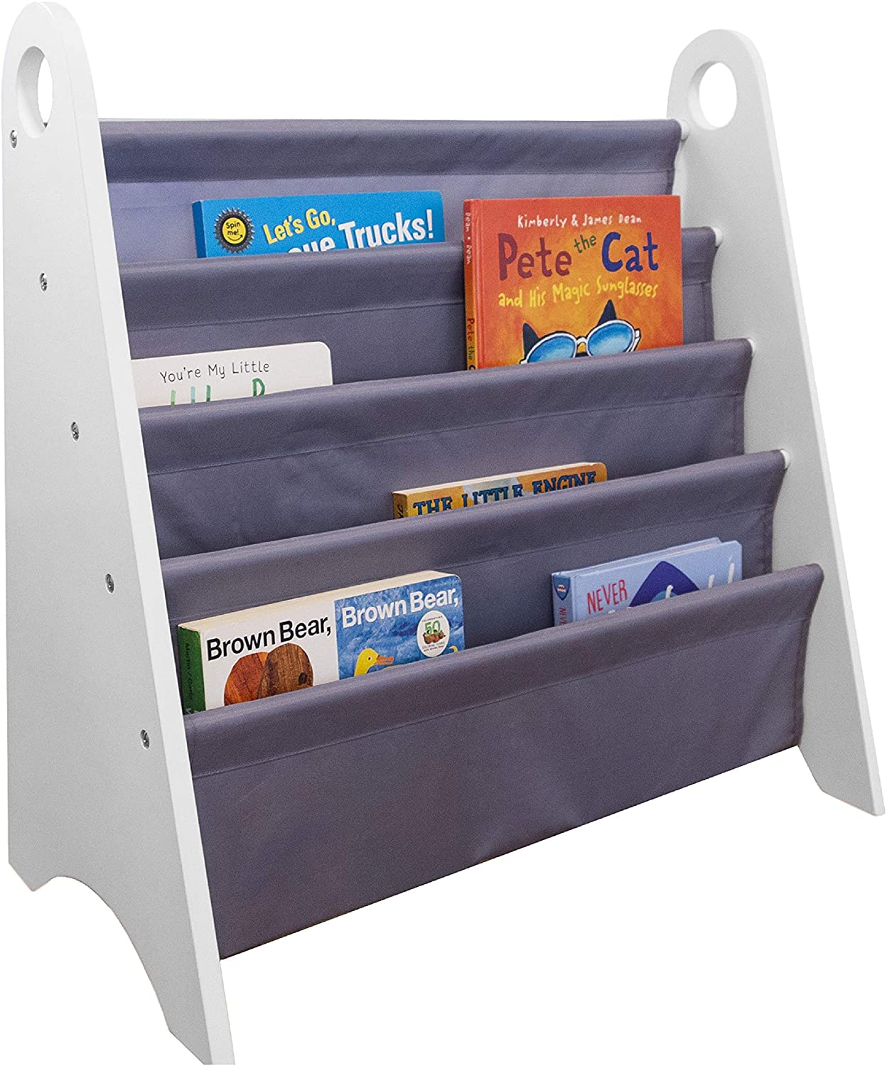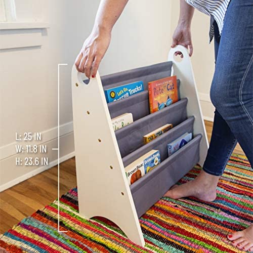 Wildkin Kids Modern Sling Bookshelf for Boys and Girls, Wooden Design Features Two Top Handles and Four Fabric Shelves, Helps Keep Bedrooms, Playrooms, and Classrooms Organized (White and Grey)