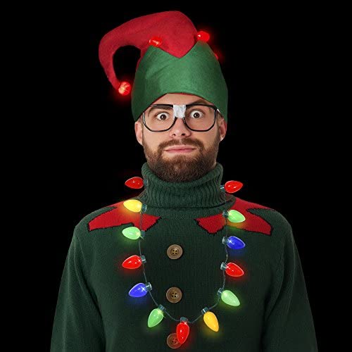 TIS THE SEASON | The holiday hoopla starts right here with this joyous LED Elf Hat and 13-light Christmas bulb necklace TIME TO GET LIT | No need for Rudolph’s nose to guide Santa’s sleigh when the 4 flashing red LEDs on the elf hat & the 13 colorful bright bulbs on the necklace glow so bright, all powered by the included & installed batteries. SPREAD JOY | Add an air of instant Christmas cheer when wearing this adorable elf hat and festive holiday light bulb necklace UGLY XMAS SWEATER FLAIR | Pair these jolly accessories with your ugliest Christmas sweater for a merry cheery contest-winning look STUFF THAT STOCKING | These wintry wearables make great holiday & Secret Santa gifts, and superb stocking stuffers.