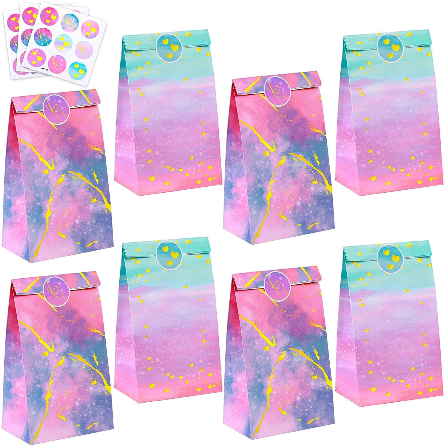 Winrayk 18PCS Tie Dye Party Bags Pink Princess Supplies Mermaid Unicorn Birthday Party Favors Bag for Girls Birthday Baby Shower Give Away Gift, Kraft Paper Party Treat Candy Goodie Bag & Seal Sticker