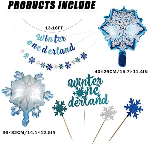 Description: 41pcs Winter Onederland Birthday Party Decorations Glitter Blue Silver Winter Onederland Banner Cake Toppers Snowflake banner for Winter Wonderland Girl Boy 1st Birthday Party Package Included: 1pc winter onederland banner 1pc Snowflake Banner 2pcs Snowflake foil balloonsr 1pc Winter ONEderland Cake Topper 12 snowflake cupcake toppers 24pcs latex balloons Notes: The winter onederland banner and Snowflake Banner need to assembled.