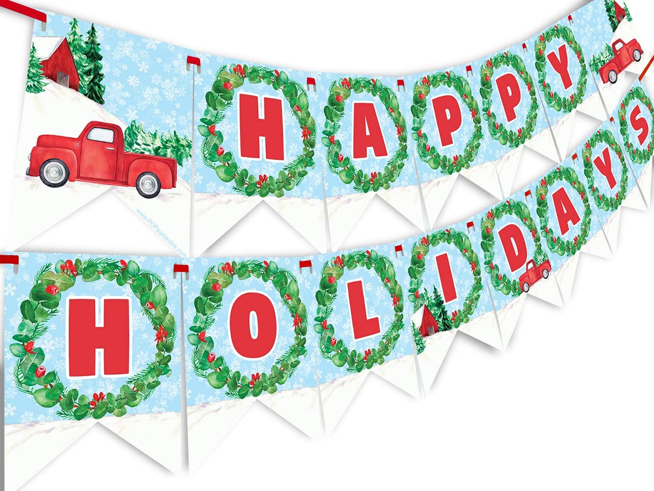 Winter Pick Up Truck Happy Holidays Banner – Red Pick Up Truck Party Supplies – Christmas Pick Up Truck Party Decorations – Christmas Party Decoration – Holiday Party Supplies- HH