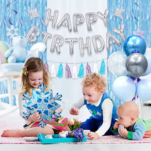 Snowflake Party Supplies Set: This winter birthday party pack includes 1 Sliver Happy Birthday Banner Balloons 4 Foil Balloon(2 Snowflake and 2 Sta…