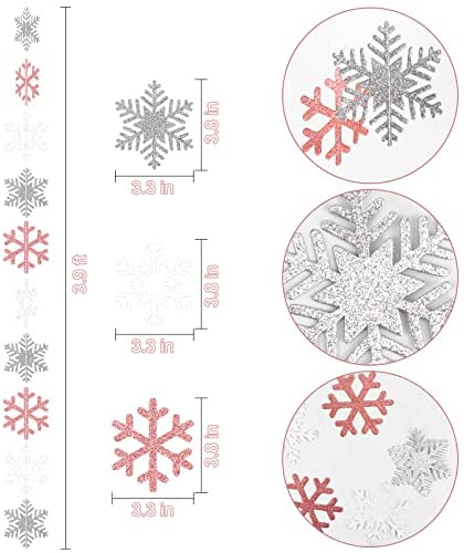 Winter Snowflake Hanging Decorations – This snowflake ornament is a perfect home decor for the all winter holidays! Silver white rose gold color combination create bright holiday accents, shiny glitter snowflakes will bring more fun and special atmosphere to your party! Premium Quality & Unique Design – Our Snowflake garlamd Made of quality glitter paper card, card stork paper with fine double-sided print, durable and reusable, nice for decorations, fetured with silver white rose gold-3 colors & 3 styles, pretty colors and exquisite craftsmanship. Pre-Assemble for Easy to Use – This snowflakes hanging decor comes with pre-strung and pre-assembled as all the pieces, super easy to use and saving your much time, just Spread it out and hang it on the place you prefer, just hang these pretty snowflakes decor anywhere you like, ideal for indoor or outdoor decorations. Perfect for Any Winter Themed Party – It can be applied in decorating Christmas, parties, New Year or winter theme party to create a winter wonderland, suitable for Baby shower, 1st Birthday party, hanging on branches and ceiling danglers, furniture, windows or walls, or table decorations, appliques or for anything that comes to your mind! What You Will Get: 10Pcs snowflake hanging swirls(Each snowflake garland is about 3.9 feet long and has 10 pieces of snowflake; 10Pcs with 100Pieces snowflake in total.), Rose Gold/Silver/White Snowflake in 3 colors and 3 styles, these pretty snowflake decorations will add a touch of sparkle to your winter party. The glimmering glitter will catch the light for a winter wonderland effect.
