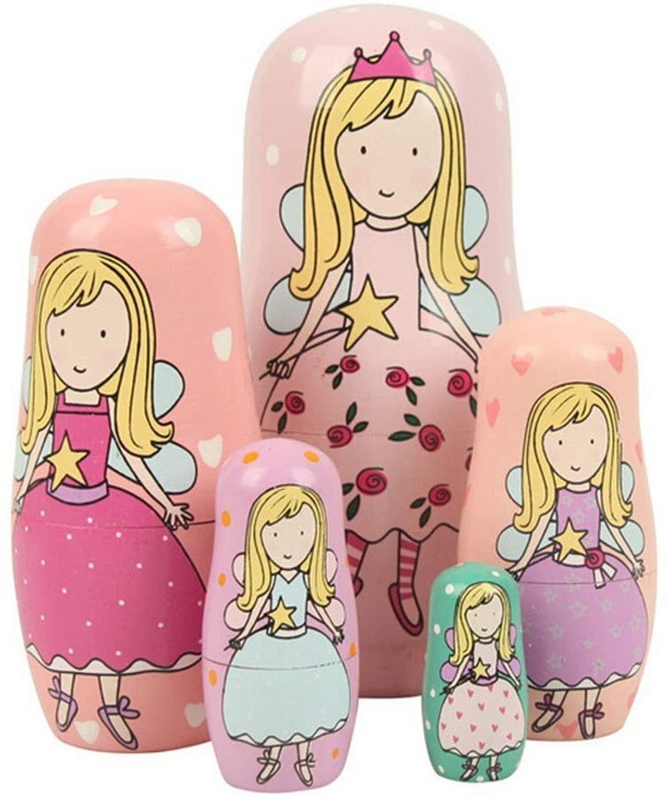 Cute pink angel princess russian nesting dolls Contains 5 dolls with 5 different pattern which is hand-painted Kids will love to play with this 5 pcs cute nesting dolls Also you can use it as a decoration Ideal gift in birthday,christmas or any special day