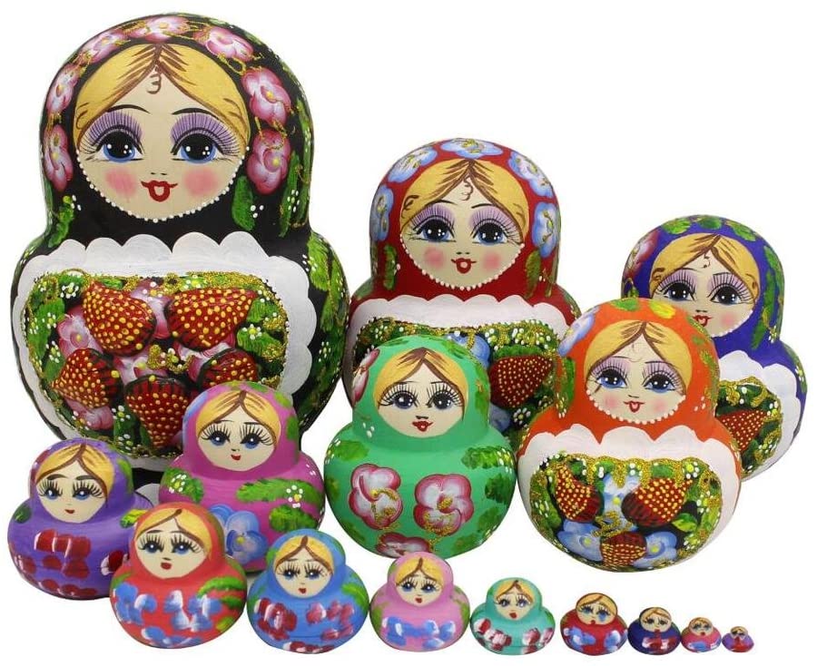 Made from sturdy and firm basswood which is known for withstanding abrasion and corrosion Colorful coatings with handmade painting and unique strawberry pattern, making it stand out from the rest Consists of a total 15 layers, a truly big and bulky set Amazing fun toys with which you can generate so great enjoyment from switching each out and putem back on, precisely A not so bad gift for kids when Christmas comes around, birthday is raging on. Voila! Nesting dolls!