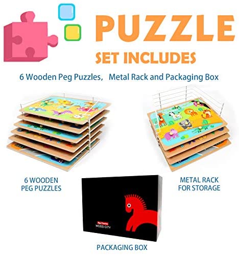 TODDLER PUZZLES WITH STORAGE RACKWOOD CITY Peg Puzzle Sets includes 6 pack wooden puzzles of different themes as well as a puzzle shelf to keep the wood puzzles within easy reach and maintain your playroom tidy by this metal puzzle rack. 6 THEMES OF GREAT ATTRACTION The kids puzzle set is not just a simple game, it is also an educational toy for toddlers aiming to help them study letters, numbers and shapes, as well as learn about animals, vehicles and dinosaurs. Each wooden pegged puzzle measures 11.75 inches (L) x 8.6 inches (W). EDUCATIONAL TODDLER PUZZLE SETOur wooden knob puzzle set is a fantastic tool for mind development, such as shape cognitive, pattern recognition, word learning and math skills. And these learning puzzles for kids may also improve hand-eye coordination and exercise fine motor skills by providing matching shapes activities for boys and girls. EASY TO GRASP PIECES The knobs on each puzzle piece are strategically designed for small guys and exactly the perfect size fitted to toddlers’ hands. Every piece is large enough to prevent babies from choking hazard, but we recommend it for kids age 2 and up. QUALITY COMMITMENT The toddler learning puzzles are perfect gift choices for Birthdays, Christmas or Childrens Day. If you have any issues with our toddler peg puzzle, do not hesitate to get in touch with us and we will be more than happy to ensure you have a satisfying buying experience.