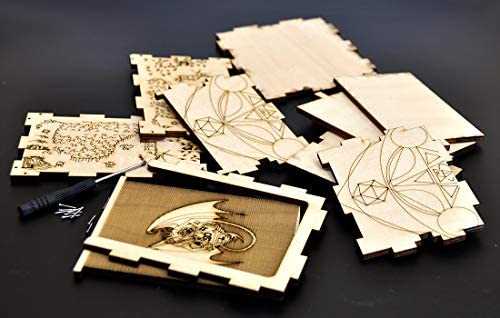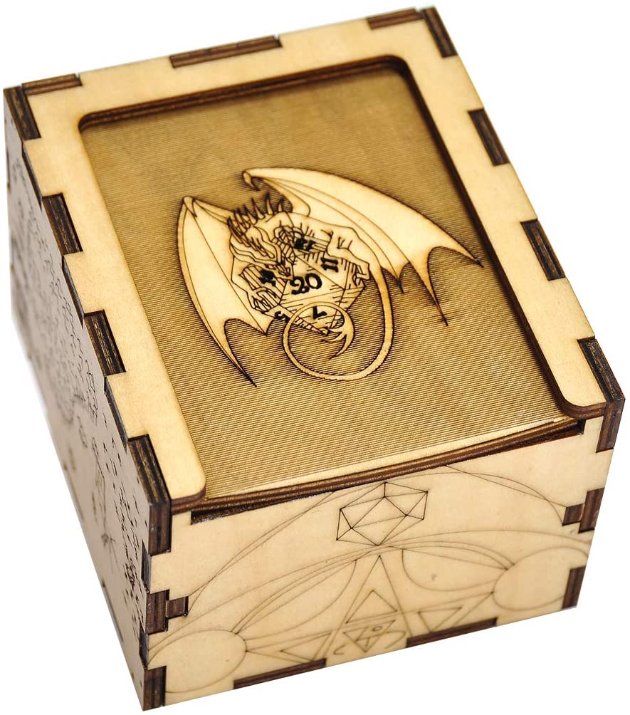 INGENIOUS DESIGN: This D&D gaming Dice Box features the cool Dragon carving on the slide top and carved with elements of dungeons and dragons the sides. It is not only functional and fun but more decorative, too! HIGH-QUALITY MATERIAL: Made from durable plywood, eco-friendly and safe. This dice vault will last in good condition for years to come. DIMENSIONS: 11.2×7.3×9.6 CM(4.4×2.9×3.8 Inches), perfectly sized to hold at least a full set of 7 standard D&D dice with room for a few spares. Theyre also great for jewelry, coins, or any other small items. DIY BOX: This puzzle box comes with 10 interlocking pieces of engraved wood. No glue required its easy to fit these pieces together with screws to be a box(Include a screwdriver and some screws). This box is a perfect idea for the handyman or anyone who enjoys DIY. UNIQUE GIFT: A perfect gift for any gamer or dragon fans. Also great for DIY lovers. Imagine if you will, that it is game day. The eyes of envy are upon you as you unseal your favorite dices from our unique dice box!
