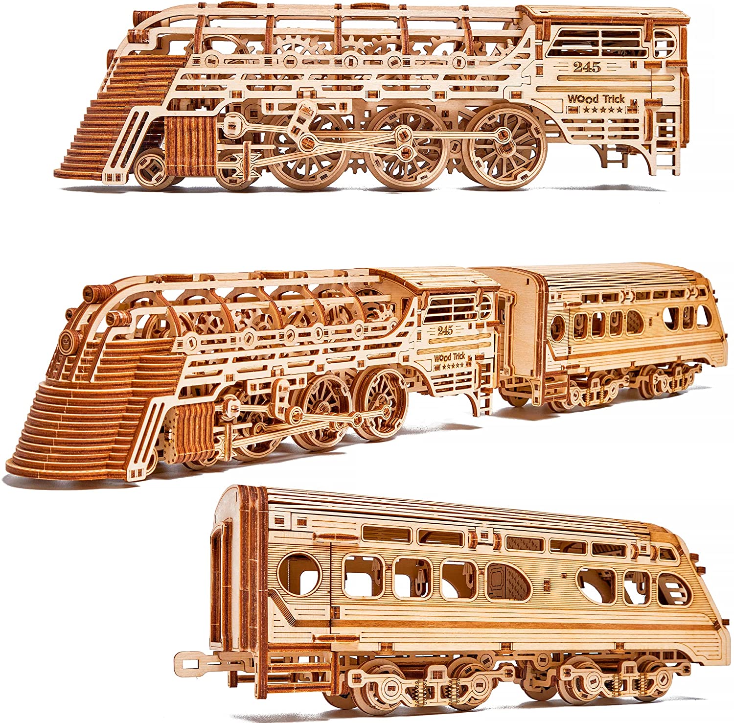 Wood Trick Atlantic Express Train 3D Wooden Puzzles for Adults and Kids to Build – 26.7×4 in – Rides up to 9 ft – Mechanical Locomotive Model Kit for Adults and Kids