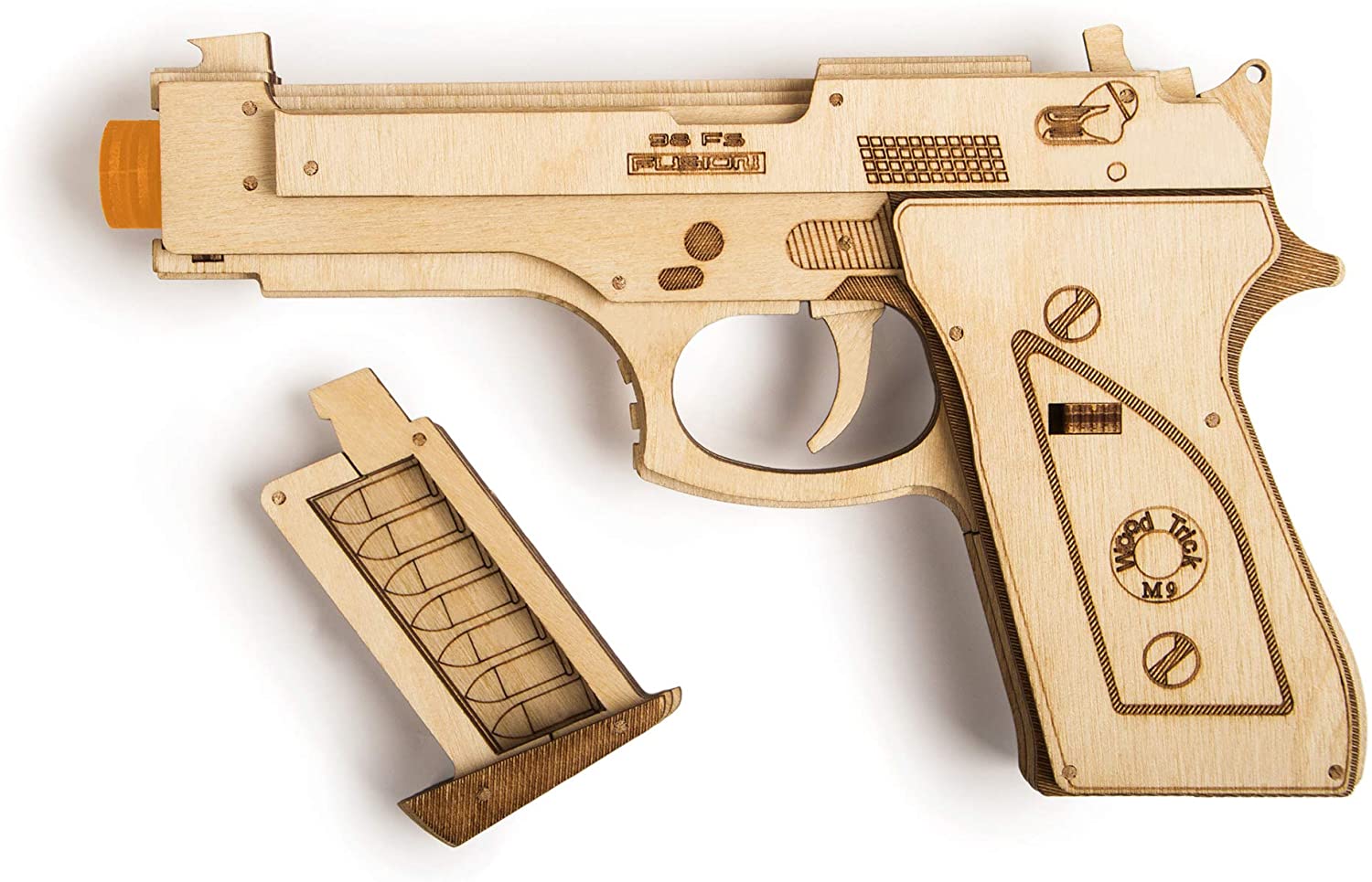 EXCITING DIY EXPERIENCE – Unlike other 3d wooden puzzles for adults and kids, our 3d gun puzzle requires a glueless manual drafting process that will entertain assemblers of any age UNCONVENTIONAL GENERAL-AUDIENCE GIFT – The semi-automatic pistol will impress both young fans of model gun kits to build and adult heroes of the festivities SUPERIOR GUN MECHANISM – This wooden toy gun contains mechanism allows to quickly load 4 safe rubber bands and shoot one after another with no need to reload ALL-IN-ONE CONSTRUCTIONAL KIT – The toy gun craft kit is a happy blend of creativity, well-thought design, ecological performance, and motor skills just like any other building kit for adults and kids by Wood Trick