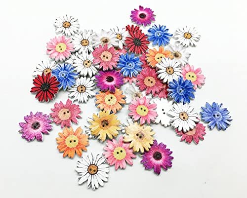 Wooden Buttons, Retro Flower-Shaped Pattern Decorative Button,Novelty Mixed Round 2 Holes Buttons Pack of 50(Multicolored-Flower)